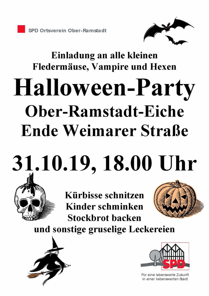 Der SPD-Ortsverein Ober-Ramstadt lädt für Donnerstag, 31.10.2019 zur traditionellen Halloween-Party beim „Schambes“ ein. Für die kleinen Vampire und Hexen sind wieder zahlreiche Aktionen geplant. Beim Kürbisschnitzen sollen möglichst gruselige Gesichter entstehen, am Lagerfeuer kann Stockbrot gebraten werden und am Schminktisch werden die Kinder halloween-mäßig verwandelt. Zum Schnitzen benötigen die Kinder passendes Werkzeug, das mitgebracht werden muss.
